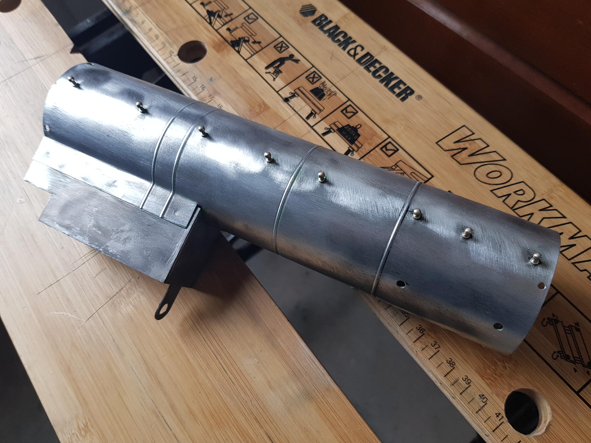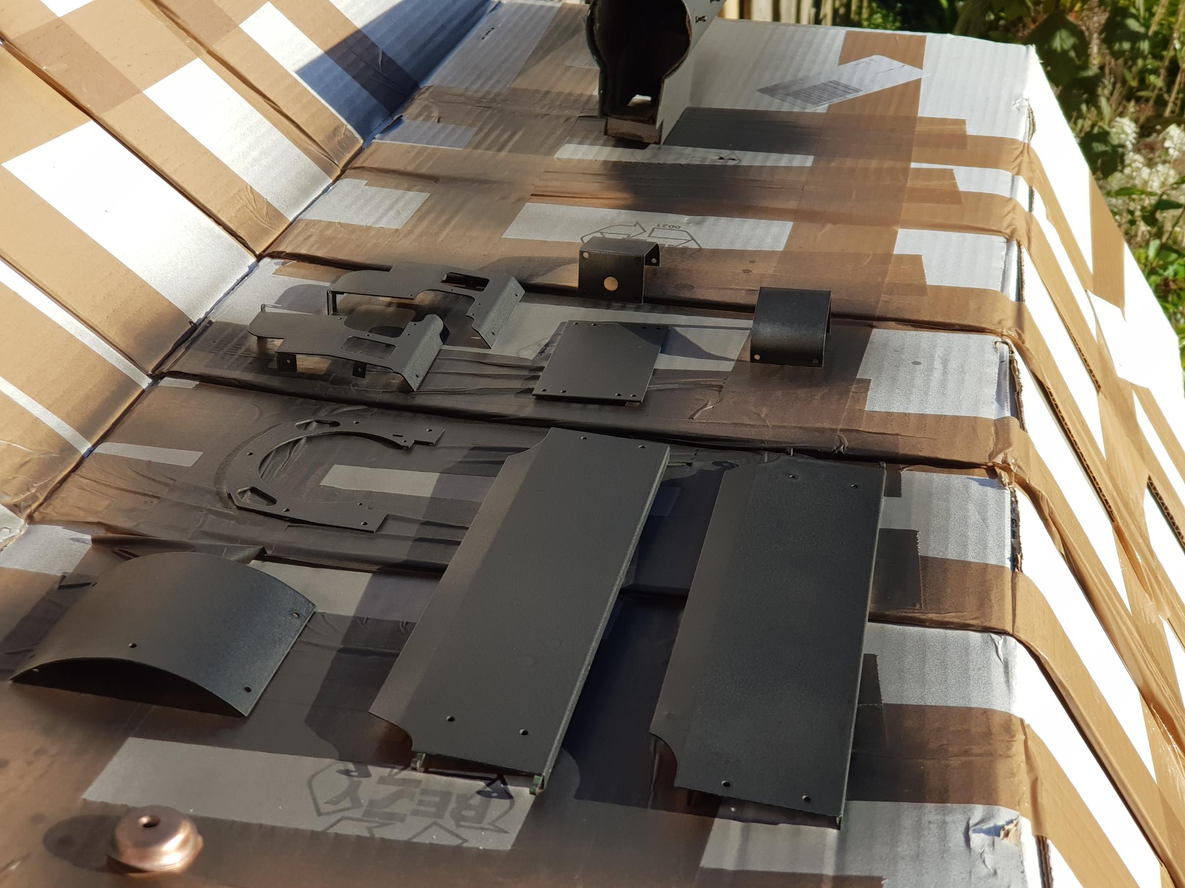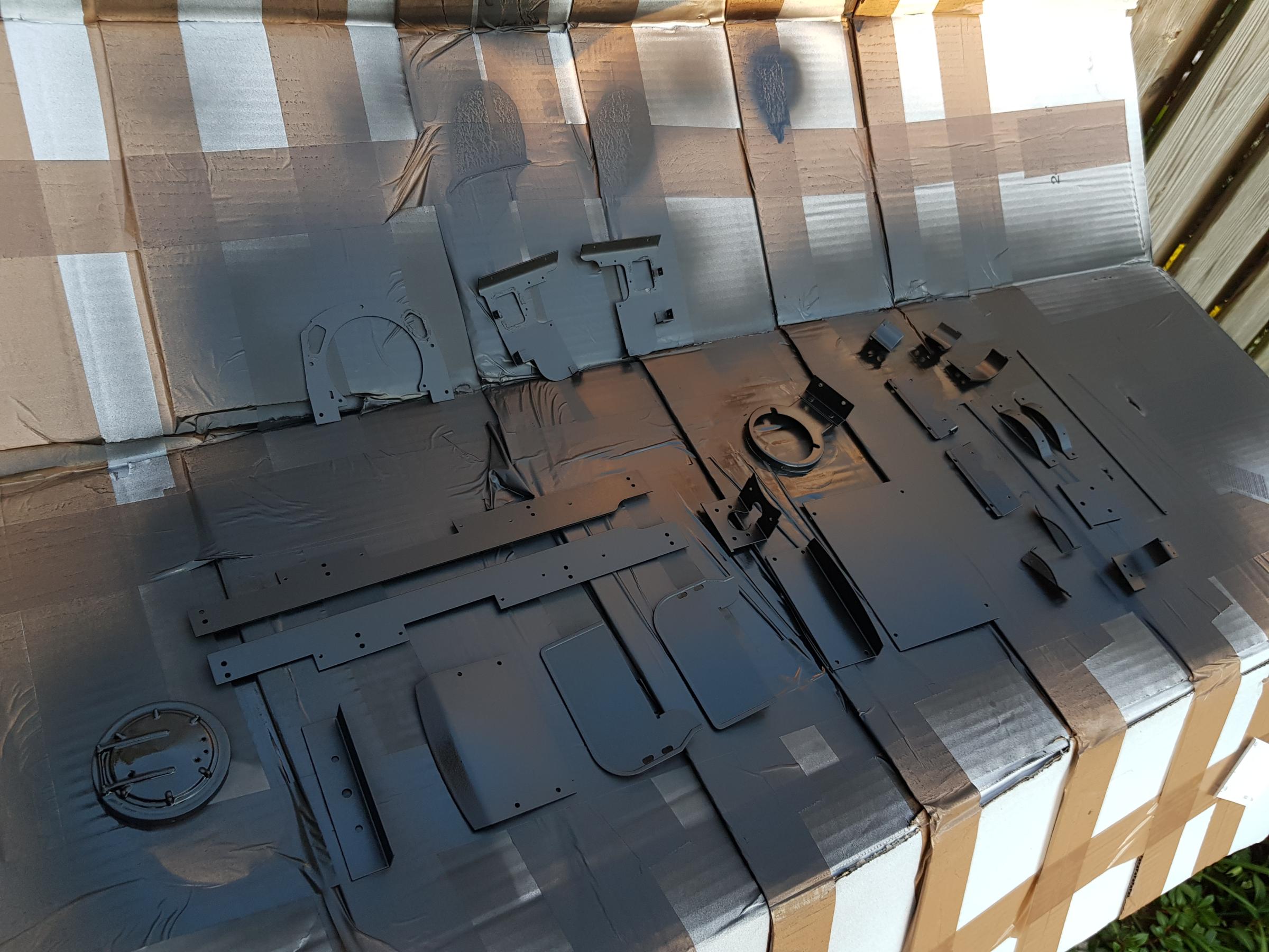 De blank geschuurde onderdelen worden in een paar lagen zwart gespoten.