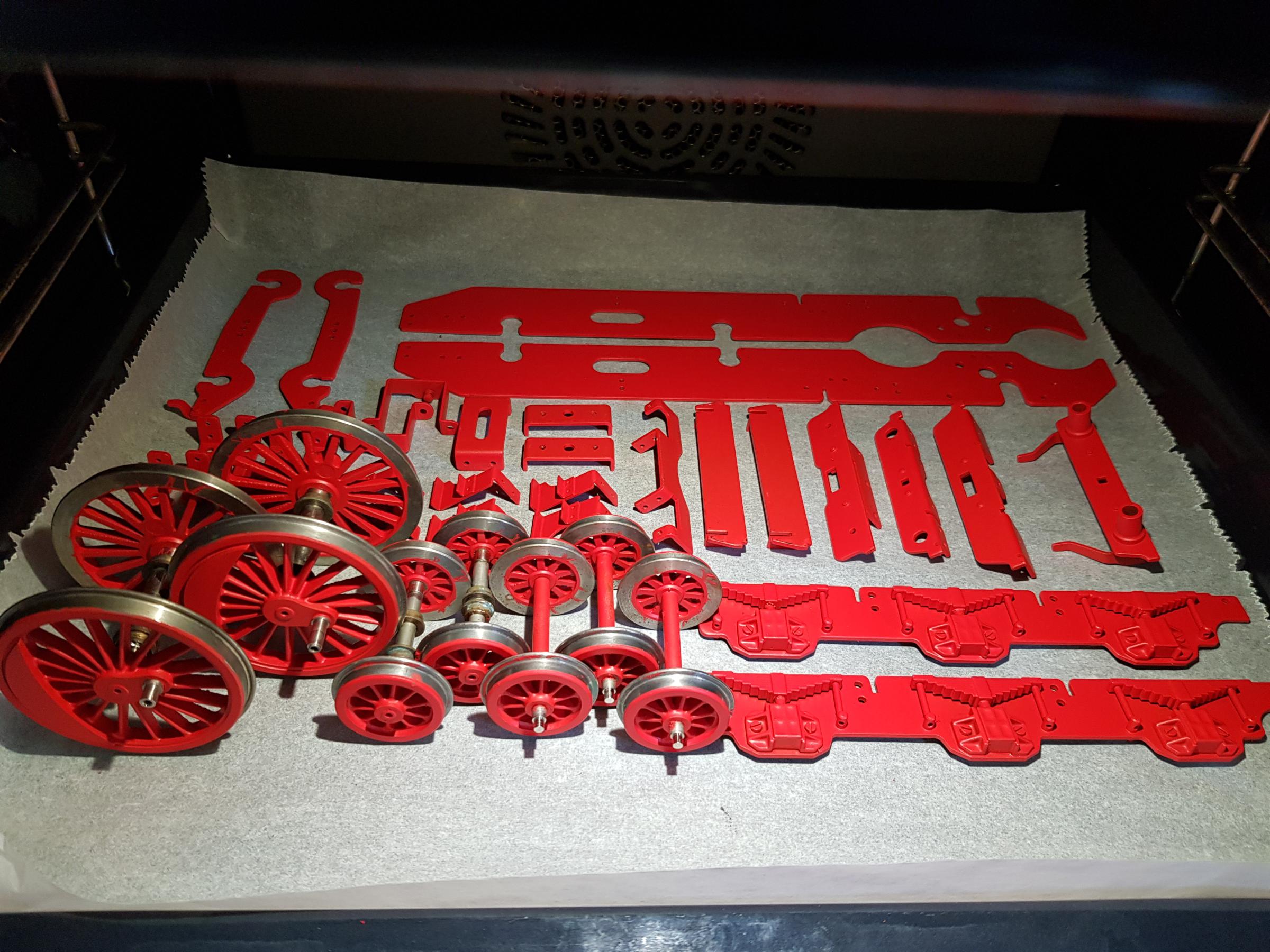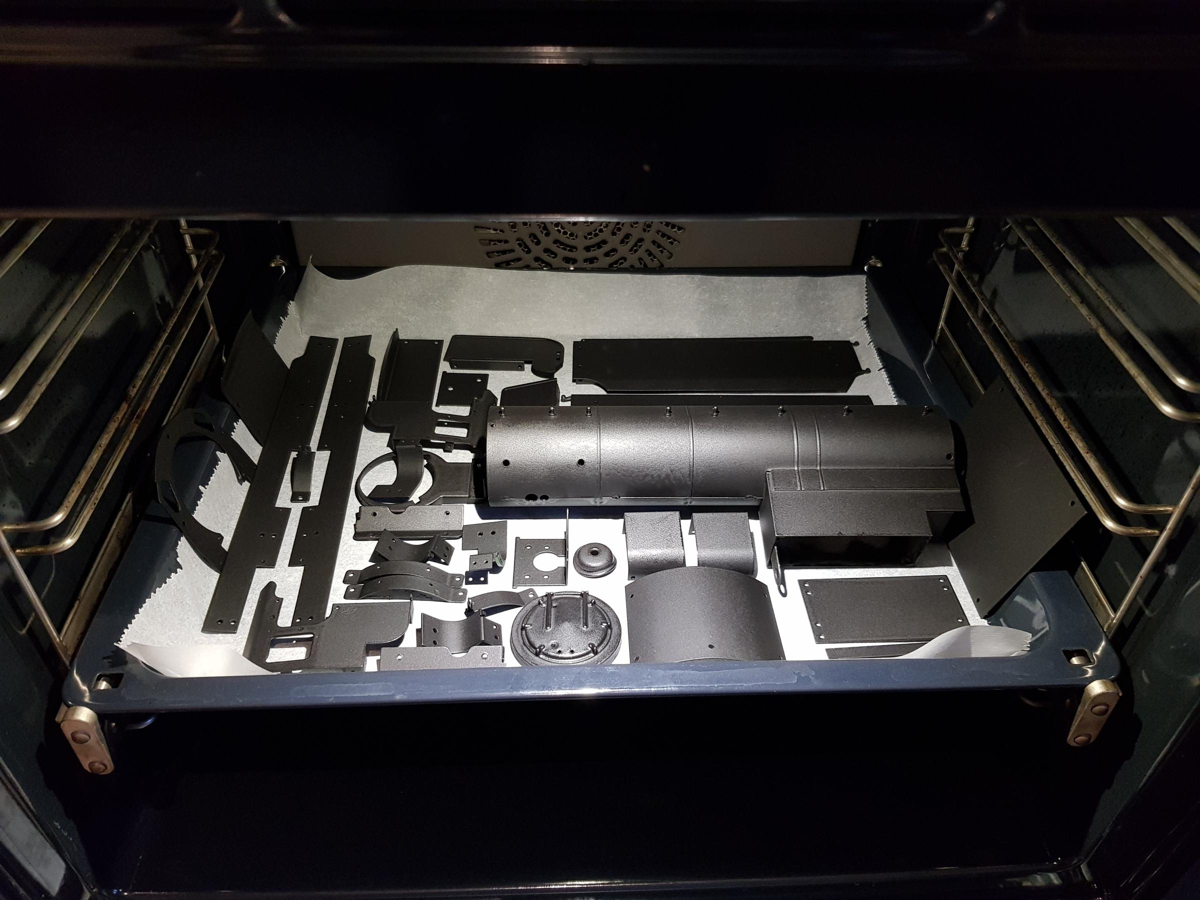 En dan gaan alle delen de oven in, om uit te harden. 45 minuten op 160 graden, zoals de handleiding van de verf dicteert. [EDIT: wat meurt dat zeg].