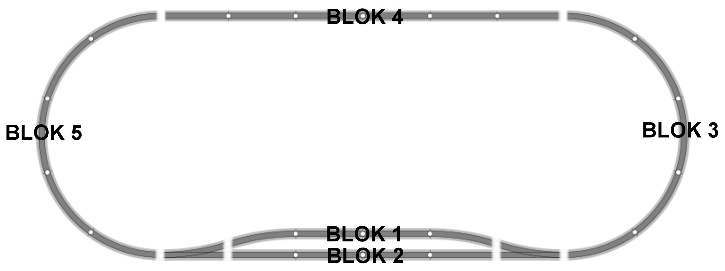 Dit ovaal moet in blokken verdeeld gaan worden, zodat straks de computer o.a. weet welke delen van de baan bezet zijn, en welke vrij. In figuur 1 heb ik reeds een blokverdeling voor het ovaal aangegeven.